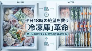 「冷凍庫がパンパンで夕飯作りがしんどい…」とお悩みの共働きワーママ必見!平日の料理を劇的にラクにする下ごしらえ食材の「立てる」整理術を紹介。100均グッズを使った収納術やラベリングで時短と節約を叶えます。