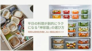 保存容器のガラス・プラスチック・シリコンを徹底比較!共働きで平日の料理がしんどい女性へ、時短が叶う賢い使い分けや、作り置きが続く選び方を紹介。カレーの色移りを防ぐ裏技や、スッキリ片付く収納のコツもご紹介。