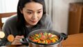 圧力鍋で調理中の食材と凍った肉を手に持つ女性