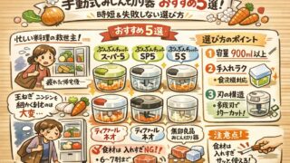 調理器具 手動式みじん切り器おすすめ5選!時短&失敗しない選び方 【2026年最新】手動式みじん切り器のおすすめ5選を徹底比較!共働きや家事を時短したい方向けに、ぶんぶんチョッパーなど人気商品の選び方やお手入れ方法を解説。失敗しないラク家事ツールを見つけよう! 2026.04.01 調理器具