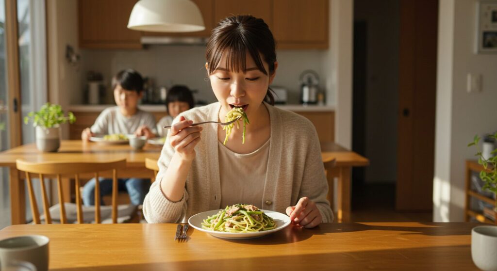 洋風料理にもごぼうの茎は活躍してくれます。この和風パスタは、ツナの旨味とごぼうの茎の食感が絶妙にマッチした、子どもたちも大好きな一品です。簡単に作れるので、ランチにもおすすめですよ。