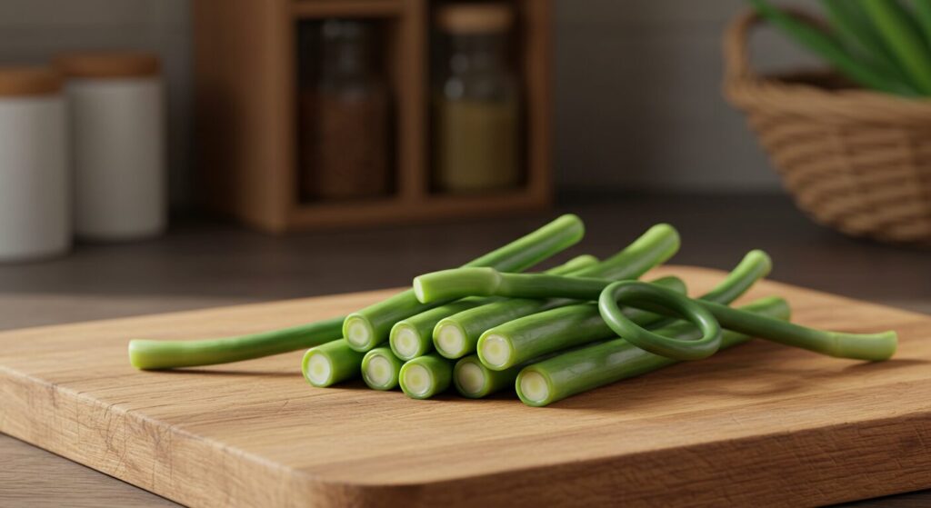 ニンニクの芽とは、ニンニクの球根から伸びてくる若い茎の部分で、正式には「茎ニンニク」や「スプラウトガーリック」とも呼ばれます。一般的なニンニクよりも香りが穏やかで、火を通すと甘みとほのかな香ばしさが引き立ちます。炒め物や肉料理と相性が良く、食卓にアクセントを加えてくれる優秀な食材です。