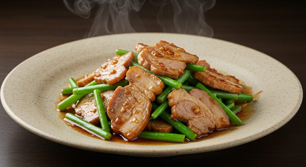 作り方は非常にシンプルで、下ごしらえ済みのニンニクの芽をサッと炒めるだけです。豚肉に火が通ったら、しょうゆ・酒・みりんを加えて調味し、最後に香りづけとしてごま油をひとたらし。短時間で仕上がるので、忙しい日や夕食のメインおかずにもぴったりです。